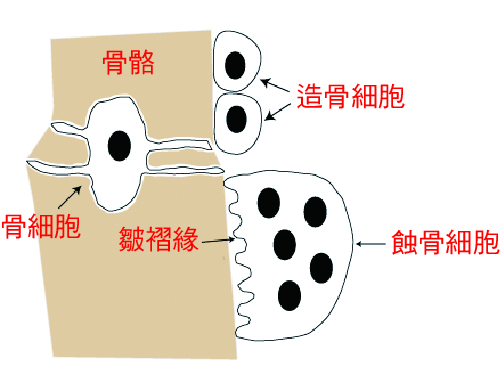 骨骼是人體儲存礦物質的大本營,其中含量最高的礦物質是鈣,其次為磷。大家或許覺得骨骼是沒什麼在變動的器官,但其實骨骼和人體其他器官一樣,有豐富的血管和神經,骨細胞不斷地新生和死亡,是極具生命力的器官。骨骼的發展,隨著出生後軟骨細胞不斷增生及骨化,以及蝕骨細胞(osteoclast)與造骨細胞(osteoblast)的活躍,長度及粗度會增加,並一直延續到成年期的初期。接下來,成人的骨骼將不再變長與變粗,但內部的骨質再塑(remodeling)仍然持續發生;骨質再塑簡單來說就是骨骼組織不斷進行汰舊換新,舊的骨質會被蝕骨細胞再吸收(resorption),接著由造骨細胞製造出新的骨基質及膠原蛋白,並礦物質化所取代,同時也可以將骨骼中的鈣及磷釋放到血液中,以維持血鈣及血磷的濃度。一旦這兩種細胞間的協調出現失衡現象,將導致骨質再塑失衡,而出現臨床上常見之骨質流失,或是較罕見的骨質異常增加。